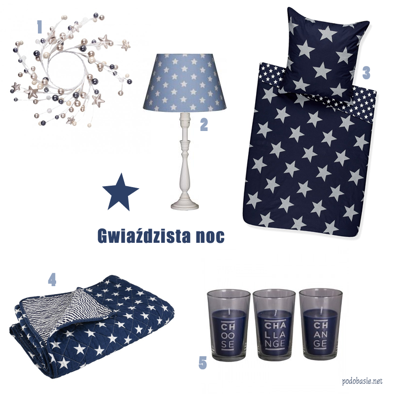 1. wianek 2. lampa z abażurem w gwiazdki 3. pościel w gwiazdki 4. pled w gwiazdki 5. zestaw granatowych świeczek